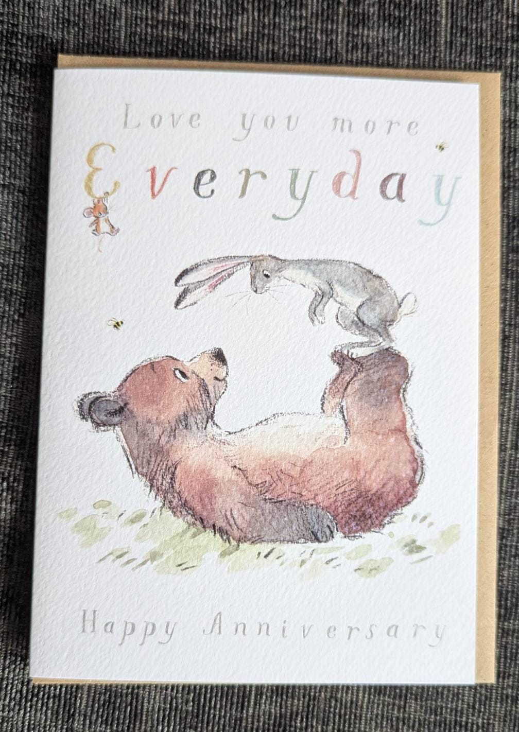 This design is so cute. My husband had got me the birthday card in the bear, hare and mouse design and I loved it so much that I thought it would be cute to get him the matching anniversary card... when we gave each other cards on our anniversary, turns out he'd had the same idea so we now have two identical cards sitting side by side on our shelf!
