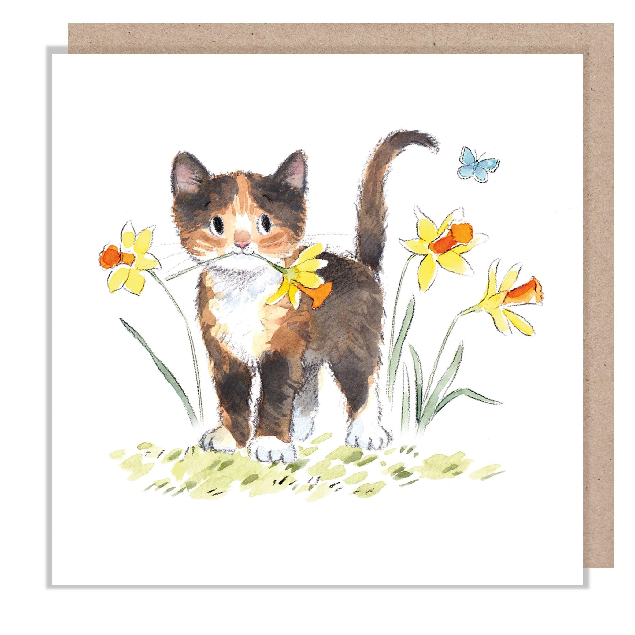 Blank Card - Quality Greeting Card - Charming illustration - 'Pawsitively Purrect' range - Cat with Daffodils - Made in UK-EPP022