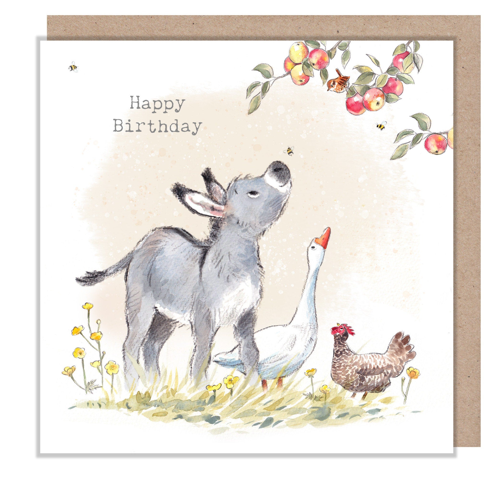 Donkey, Goose & Hen Birthday Card: Charming Farm Illustration
