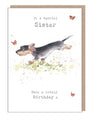 Sister Birthday Card - Running Sausage Dog with Butterflies Illustration ABE073